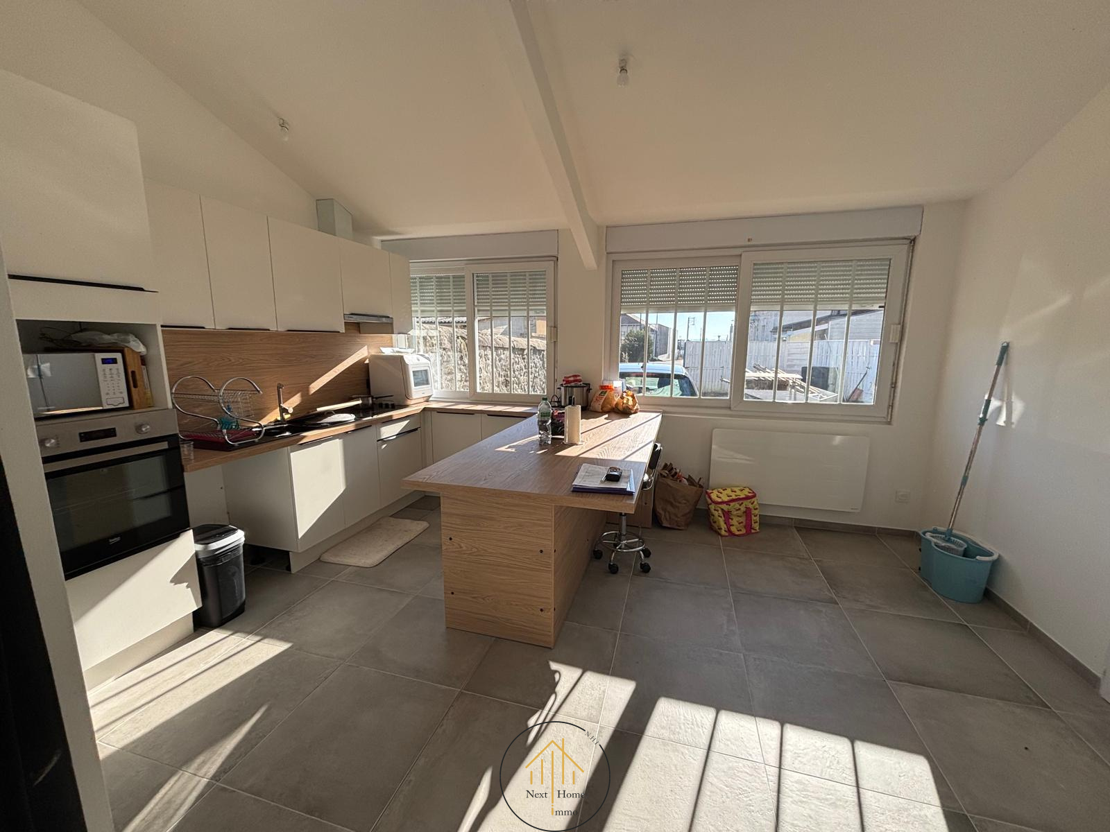 De plain-pied, elle se compose de 3 pièces: Un séjour de 34 m², une cuisine aménagée et équipée, 2 chambres, une salle d'eau avec WC, un WC indépendant et une buanderie.