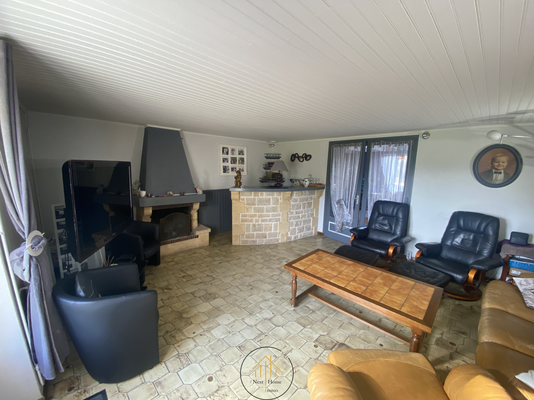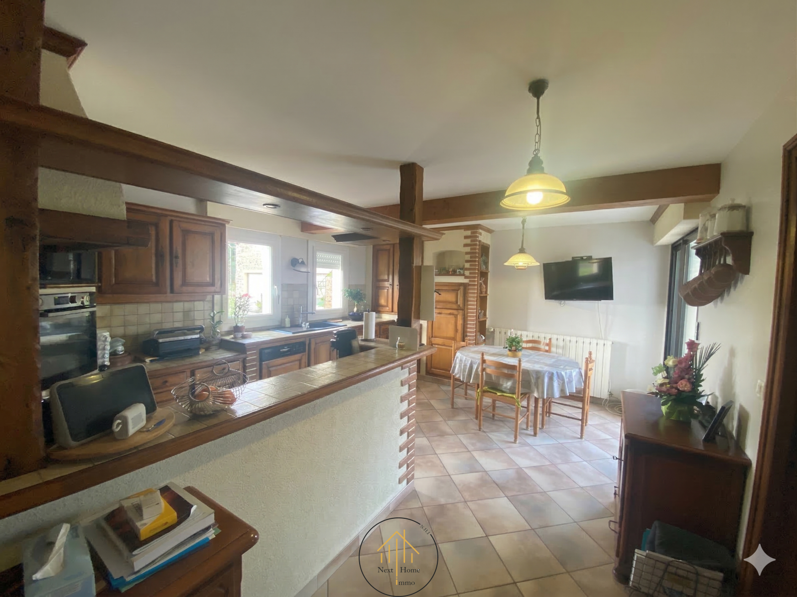 - Au rez-de-chaussée : une entrée qui dessert un grand espace de vie comprenant une salle à manger/séjour de 38 m², un salon agrémenté d'une cheminée et d'un bar en pierres, une cuisine en bois massif entièrement aménagée et équipée, donnant accès sur la terrasse et la piscine. Ce niveau inclut également trois chambres, une salle de bain, et un WC indépendant, offrant une vie de plain-pied possible.